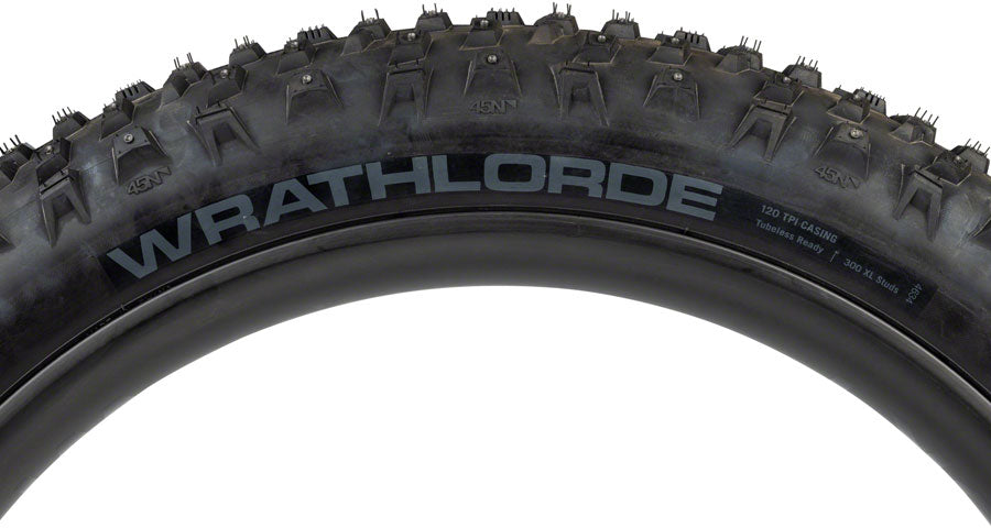 45NRTH Wrathlorde Tire - 27.5 x 4 Tubeless Folding Black 120 TPI 300 XL Concave Carbide Studs. Wrathlorde is an extreme-conditions fat bike tire designed for ultimate traction on challenging surfaces. Aggressive tightly-spaced lugs decrease rolling resistance without compromising on traction while 300 XL concave studs bite into ice for complete confidence.