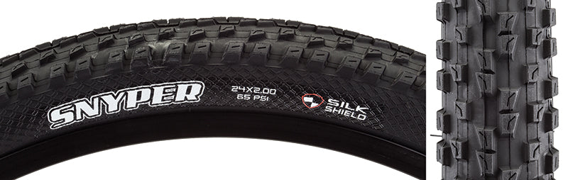 Maxxis Snyper Tire - 24 x 2 Clincher Folding Black Dual SilkShield. The Snyper is a true performance XC trail tire for younger riders.Ramped center knobs roll fast and aggressive shoulder lugs deliver excellent cornering traction