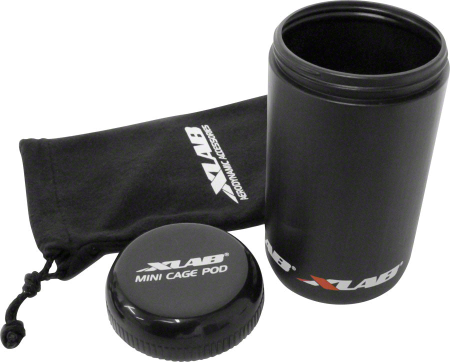 XLAB Mini Cage Pod: Black. The Mini Cage Pod stores repair items and other essentials in any standard water bottle cage.Screw top design is waterproof